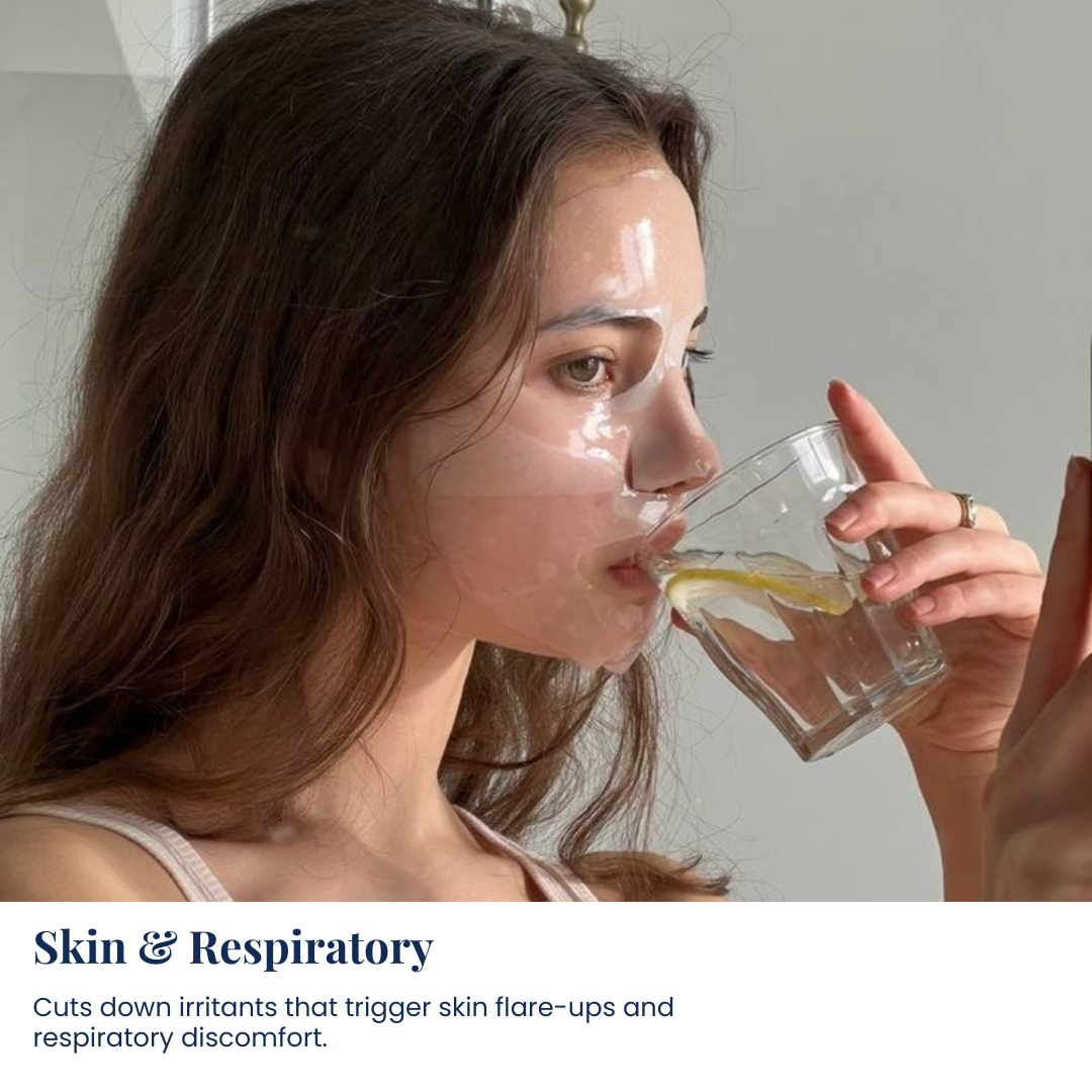 Chlorine, THMs, and HAAs are known irritants that can trigger eczema, dry skin, dermatitis, asthma flare-ups, respiratory inflammation, coughing, and long-term lung irritation.