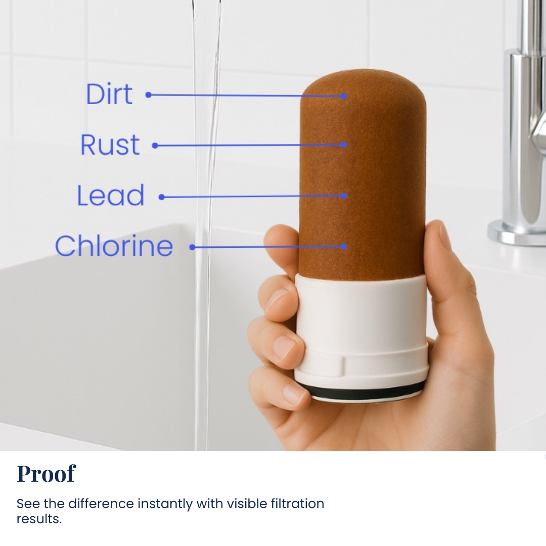 The Filtura™ Tap Water Filter uses advanced multi-stage nanofiltration, powered by high-grade activated carbon, to help reduce 150+ contaminants — including chlorine, PFAS, heavy metals, microplastics, pesticides, and more.